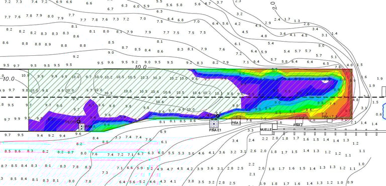 Combinando varios de los servicios anteriores, nos encargamos del análisis y control exhaustivo de las diferentes unidades de obra marítima, cálculos de volumetría de corte y relleno y nos encargamos de la redacción de documentación gráfica y escrita informando de los avances de obra.